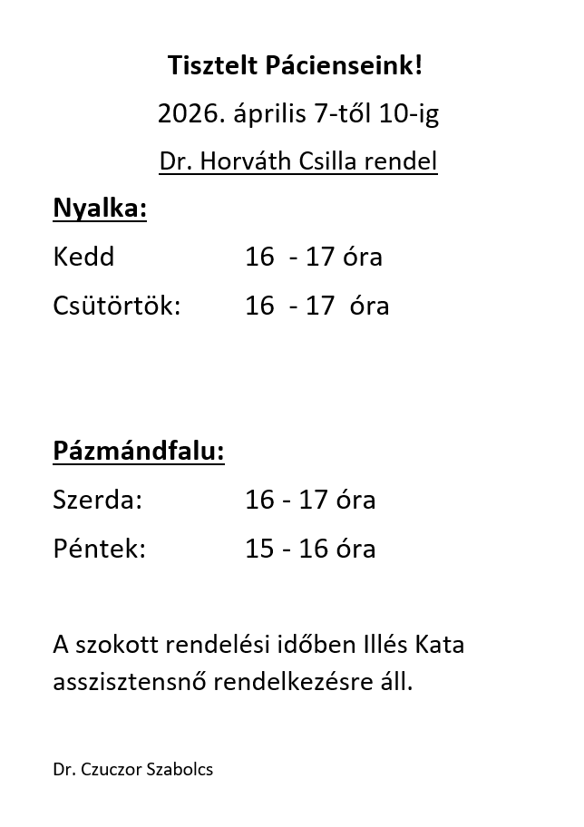 Tájékoztatjuk Önöket, hogy Pázmándfalu - Nyalka háziorvosi körzetben a rendelés május 21-23 között a következőképpen alakul.