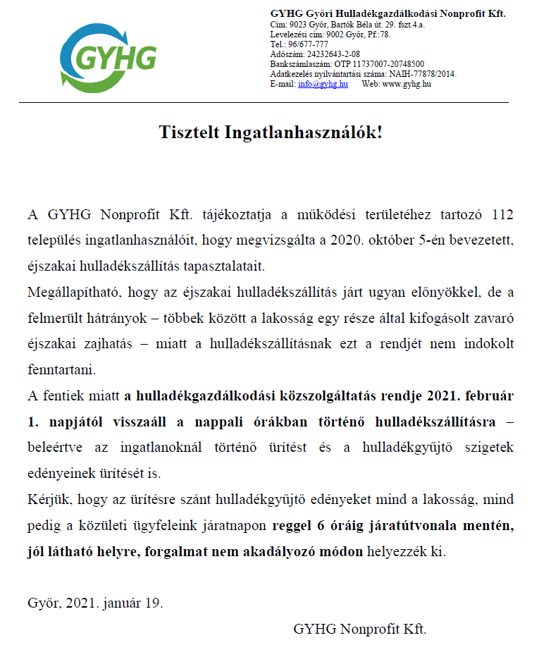 Tájékoztató hulladékszállítás változásáról