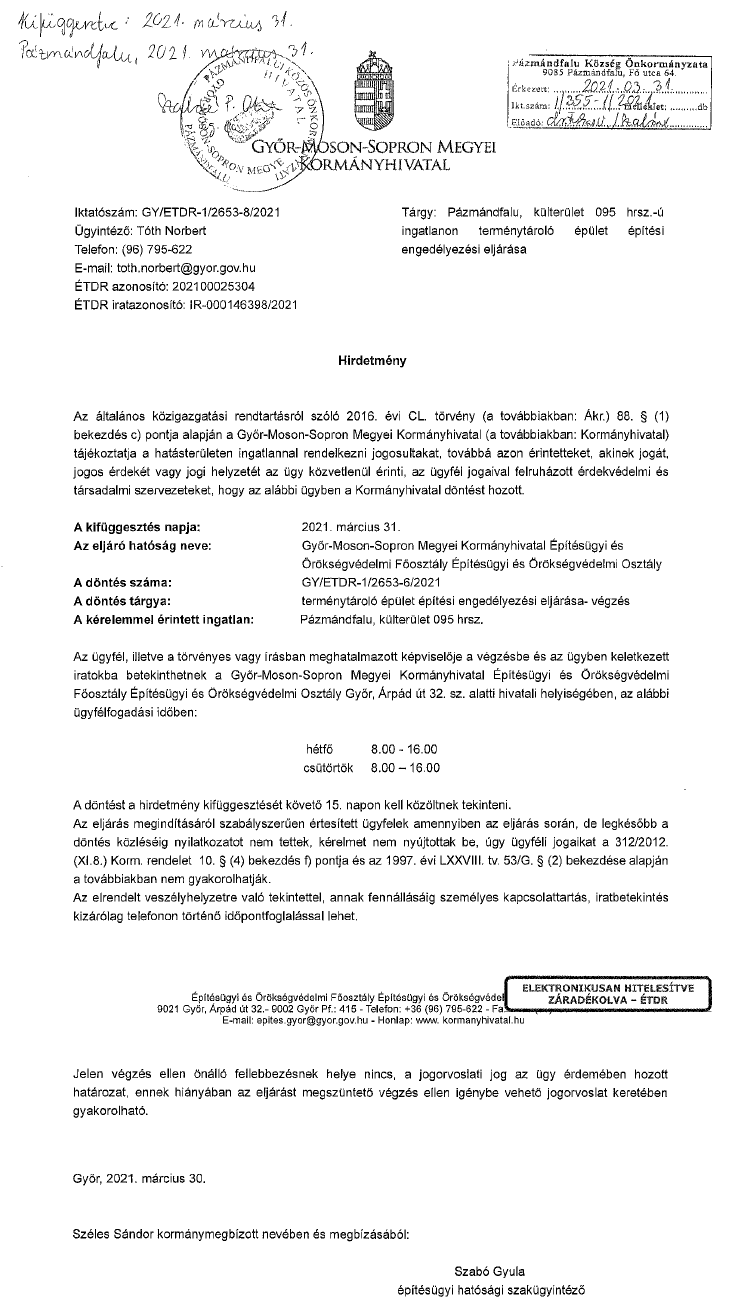 Hirdetmény - terménytároló építéséről