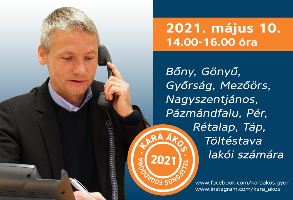 2021. május 10-én, hétfőn 14.00 és 16.00 óra között lesz, amelyet Bőny, Gönyű, Győrság, Mezőörs, Nagyszentjános, Pázmándfalu, Pér, Rétalap, Táp, Töltéstava lakói számára tartok.