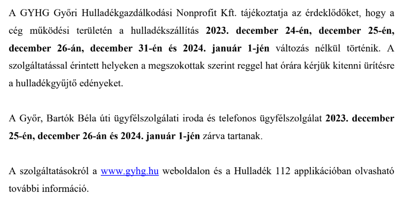 A hulladékszállítás az ünnepek alatt a következőképpen zajlik:
