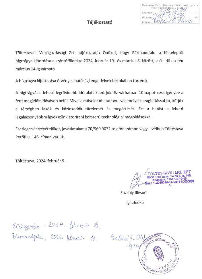 Tájékoztató trágya kihordásról